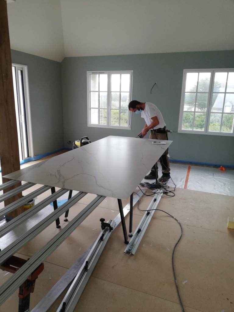 Pose sur mesure Tranche céramique Format XXL , du 100cm x 100cm jusqu’au 320cm x 160cm , au sol comme au mur , nous nous adaptons l’espace à vos envies .